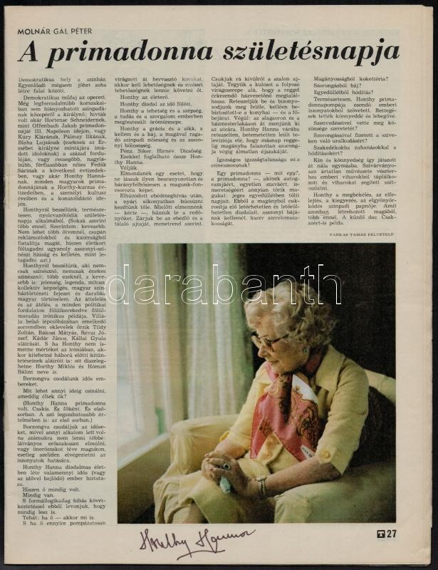 Leírás: Honthy Hanna (1893-1978) színésznő aláírása újságon