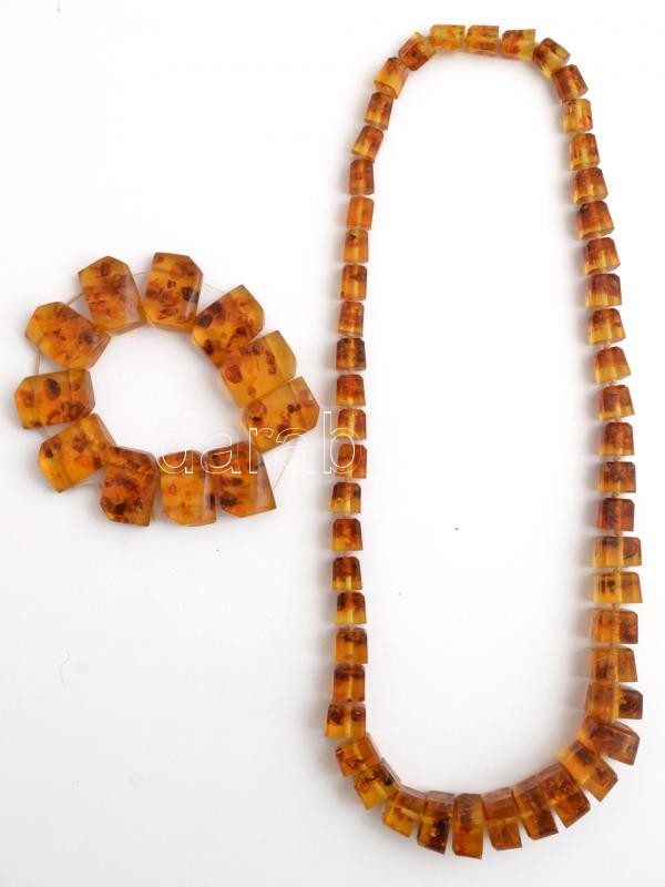 Leírás: Borostyánszerű nyaklánc és karkötő, d: 8 cm, h: 31 cm.