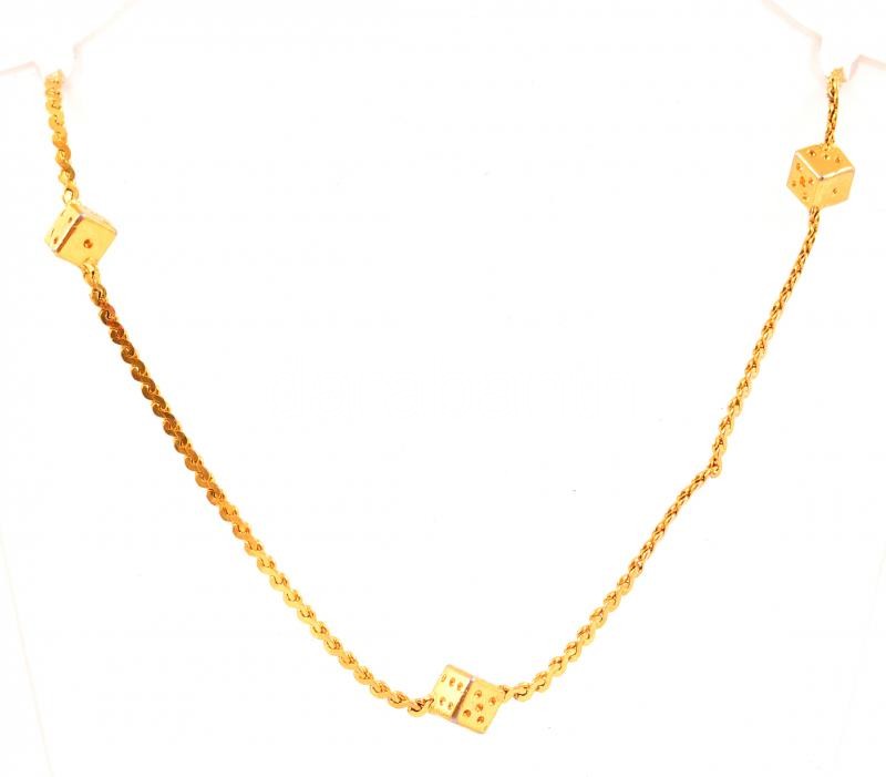 Leírás: Dobókockás díszítésű, aranyszínű bizsu nyaklánc, h: 78 cm