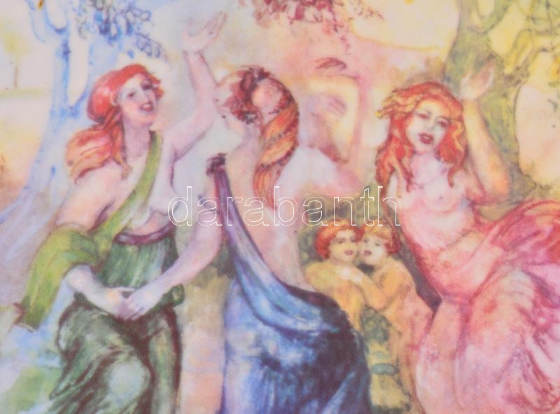 Leírás: Fábián Rózsa (?- ): Nimfák, porcelán kép bőr foglalatban, matricás, jelzett, d: 19,5 cm (tányér), 30×30 cm (foglalat)
