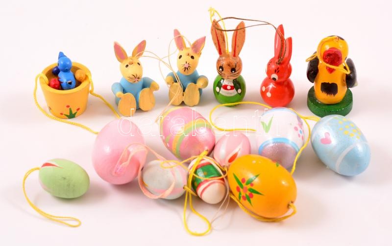 Leírás: Húsvéti felakasztható díszek, tojások és nyuszik kis méretben, 15 db