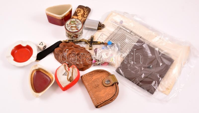 Leírás: Kis vegyes bolha tétel: kis porcelánok, öngyújtó, gombok, fülbevaló pár, stb., érdekes anyag