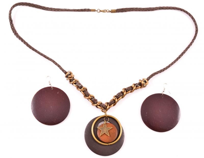Leírás: Nagyméretű fafülbevaló és lánc bőr szíjon.