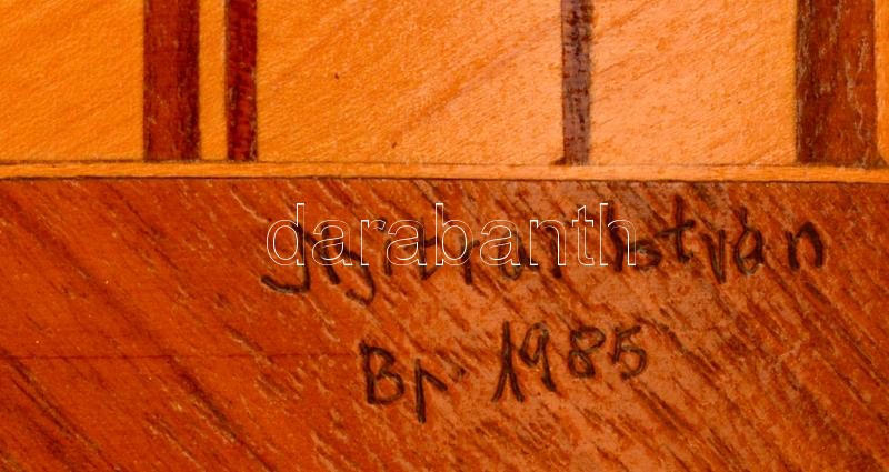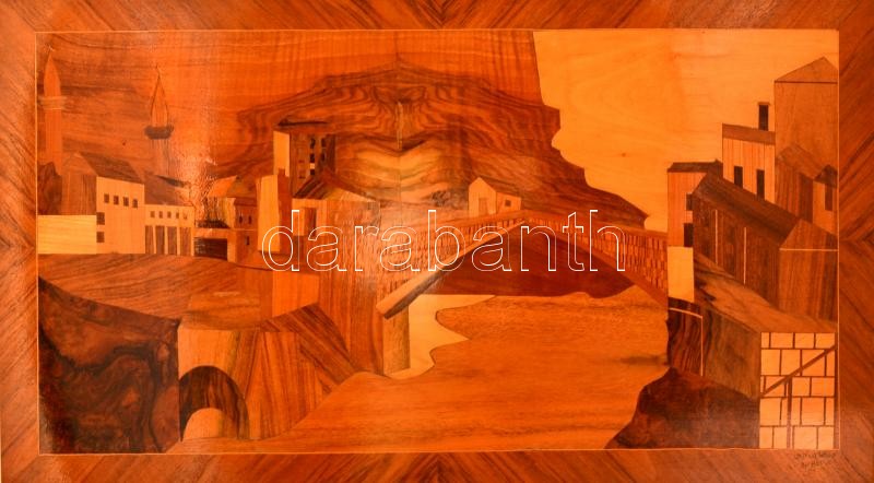 Leírás: Nyitrai István (?-?): A mostari Öreg-híd, fa intarziás kép, jelzett, 44,5×81,5 cm