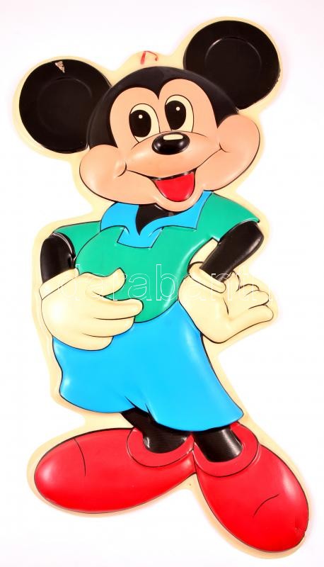Leírás: Retró Mickey egér falikép, átlátszó vékony műanyag, kopott füllel, akasztóval, 61×35 cm