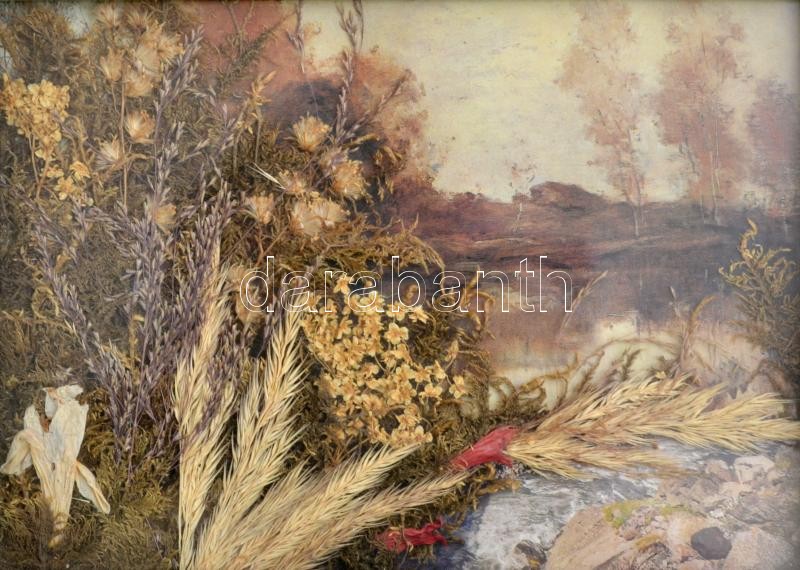 Leírás: Táj kép nyomat száraz virágokkal, üvegezett keretben, 12×17 cm