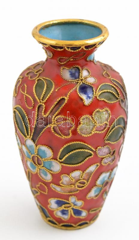Leírás: Zománcozott réz kis váza, jó állapotban, m: 8 cm