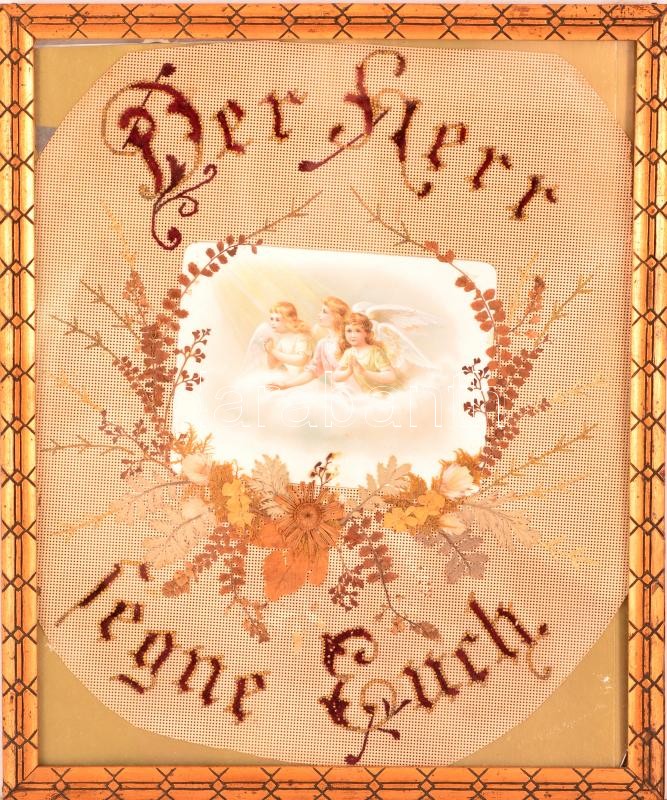 Leírás: cca 1920 "Der herr legne Eurch", zárda munka, nyomat-kollázs, üvegezett keretben, 29×24