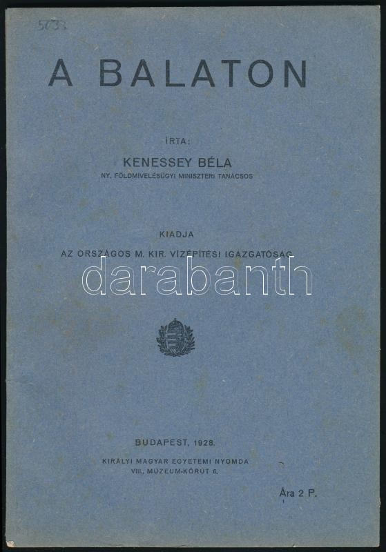 Leírás: Kenessey Béla: A Balaton. Kiadja: az Országos M. Kir. Vízépítési Igazgatóság. Bp., 1928, Kir. M. Egyetemi Nyomda, 43 p.