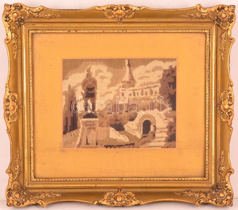 Leírás: Régi blondelkeret, kopott, belül gobelin képpel, belső méret: 24×29 cm, külső méret: 33×36 cm, kopott aranyozással