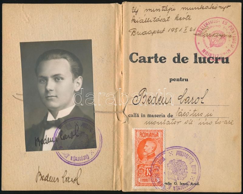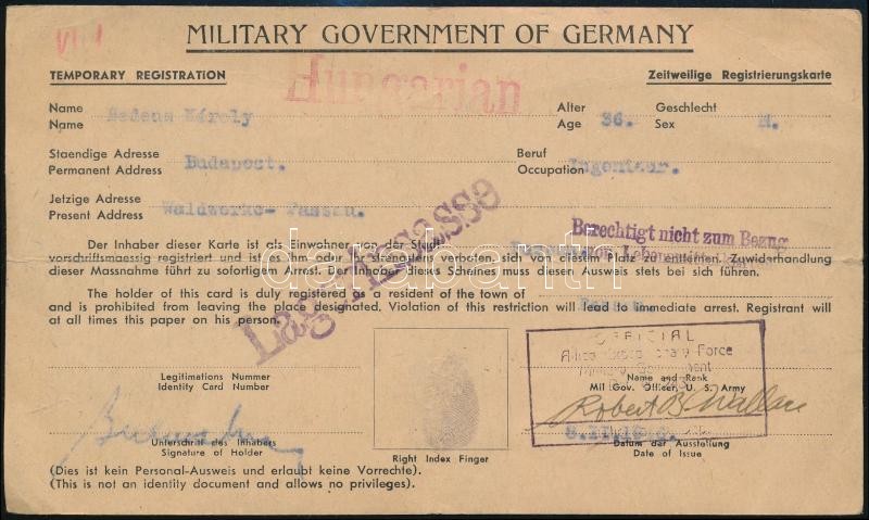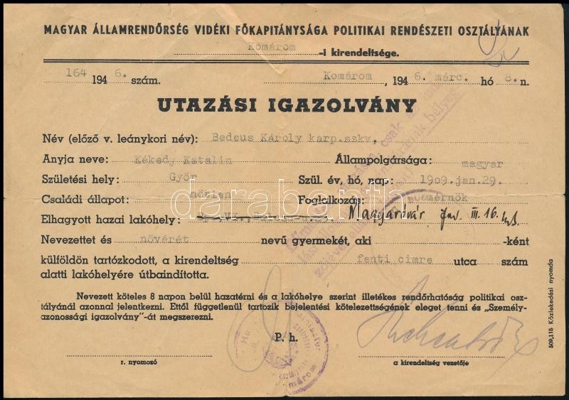 1927-1946 Vegyes okmány tétel, ugyan annak a személynek a részére, 3 db 1946 Ideiglenes nyilvántartásba vételi igazolvány, Németország Katonai Kormányzata, Passau/Waldwerke, német nyelven.+1946 Komárom, utazási igazolvány, magyar államrendőrség által kiállítva. +1927 román munkavállalási igazolvány, magyar személy részére, román nyelven. /1927-1946 3 pc of documents for same person: 1946 Temporary registration, Military Government of Germany, Passau/Waldwerke, in german language.+1946 Komárom, travel card, by Hungarian Police, in Hungarian language.+1927 Rumanian work card for Hungarian person