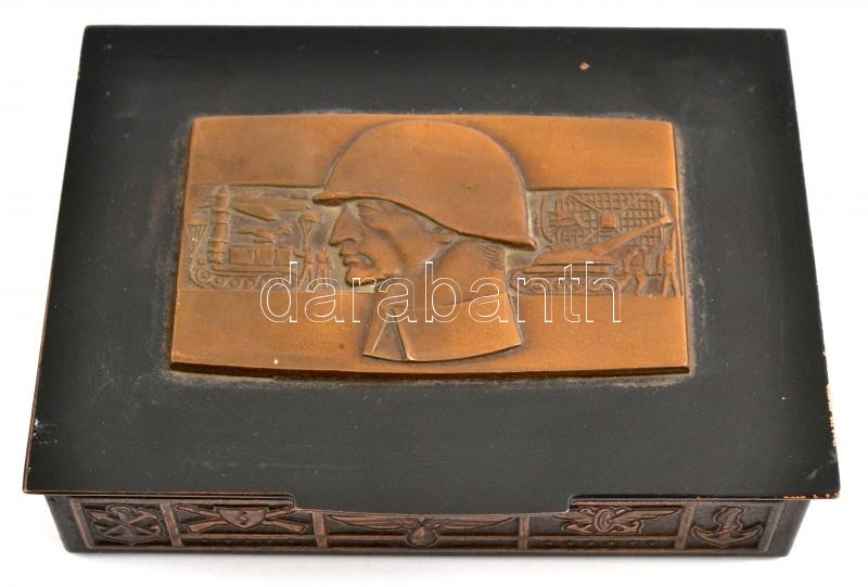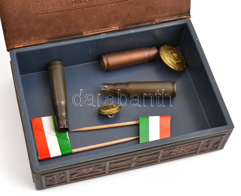 Leírás: Honvédségi szolgálati emlékdoboz, benne töltényhüvelyek, rendőri gombok