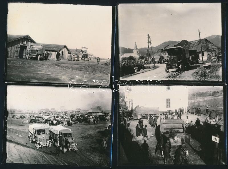 Leírás: cca 1914-1918 Katonai alakulatok táborhelye és haladása autóval, 4 db eredeti negatívról előhívott fotó, 9×12 cm