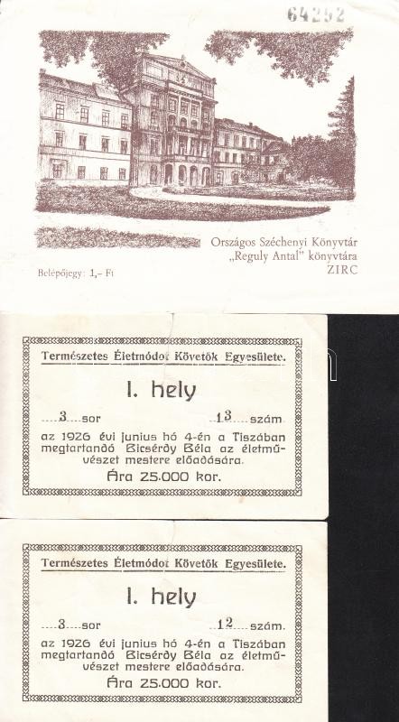 Leírás: 1926 Természetes Életmódot Követők Egyesülete két belépő a Tiszában megtartott Bicsérdy Béla előadásra. + egy könyvtári belépő Zirc.
