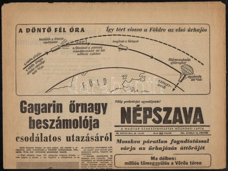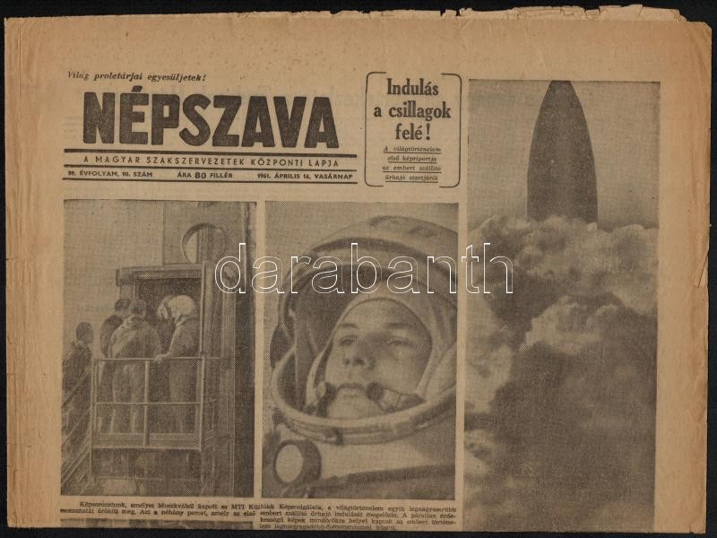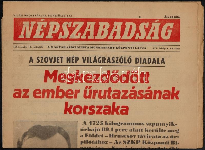 1961 Vegyes újság tétel, 3 db (2 db Népszava, 1 db Népszabadság, benne az űrutazással kapcsolatos hírekkel, a címlapokon Gagarinnal. Változó állapotban.