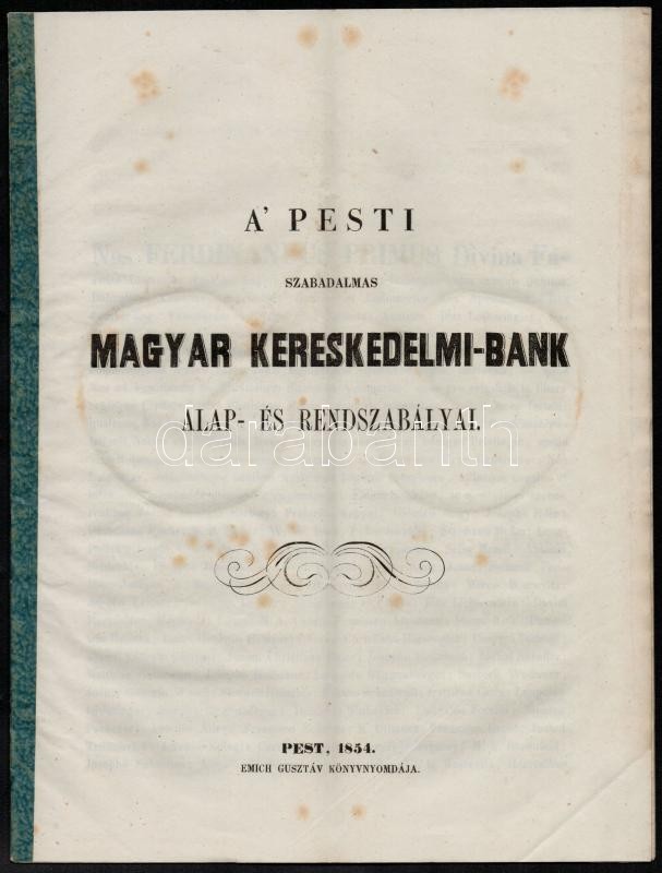 Leírás: A' Pesti szabadalmas Magyar Kereskedelmi Bank alapszabályai. Pest, 1854. Emich. 26p.