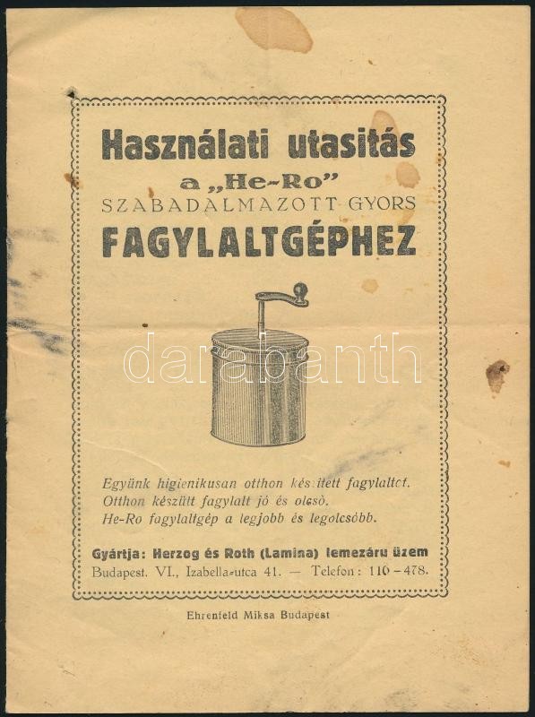 Leírás: cca 1920 HE-RO fagylaltgép használati utasítás és receptek. 8p.
