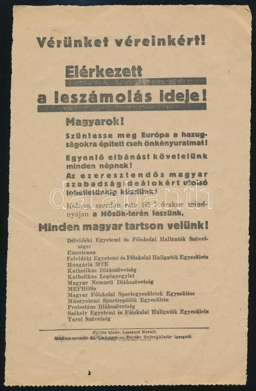 Leírás: cca 1920 "Vérünket véreinkért! Elérkezett a leszámolás ideje!", irredenta röplap