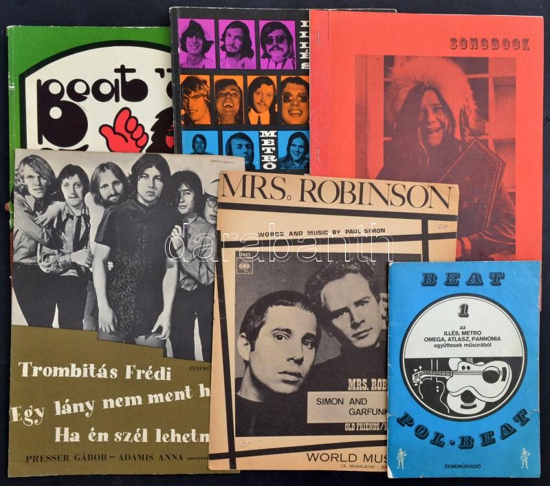 cca 1960-1970 Vegyes zenei témájú nyomtatvány tétel, 6 db: Beat Pol-Beat 1. füzet kotta, Beat '70 kotta, Beat Story, Presser Gábor-Adamis Anna: Trombitás Frédi-Egy lány nem ment haza-Ha én szél lehetnék kotta, Janis Joplin Songbook, Simon and Garfunkel: Mrs. Robinson kotta. Változó állapotban.