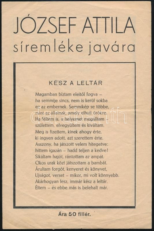 cca 1970 József Attila síremléke javára. Bp., Világosság Rt., 2 sztl. ... https://www.darabanth.com/hu/344-Gyorsarveres/344.0/Mutargy-papirregiseg-egyeb/Nyomtatvanyok~31/cca-1970-Jozsef-Attila-siremleke-javara-Bp-Vilagossag-Rt-2-sztl-lev~II1942682
