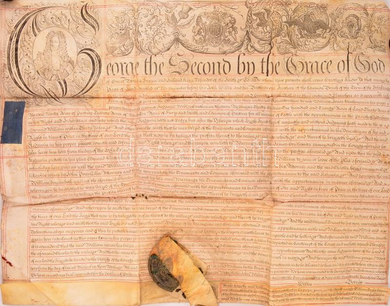 Leírás: 1744 II. György angol király díszes kiállítású oklevele gloucestershire-i birtokügyben, pergamen, töredékes függőpecséttel