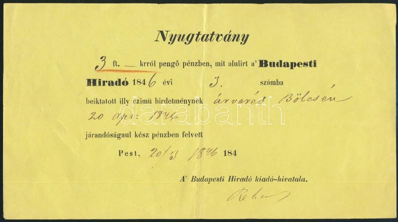 1846 Nyugta a Budapesti Hiradóba felvett hirdetésről https://www.darabanth.com/hu/344-Gyorsarveres/344.0/Mutargy-papirregiseg-egyeb/Okmanyok~19/1846-Nyugta-a-Budapesti-Hiradoba-felvett-hirdetesrol~II1952823