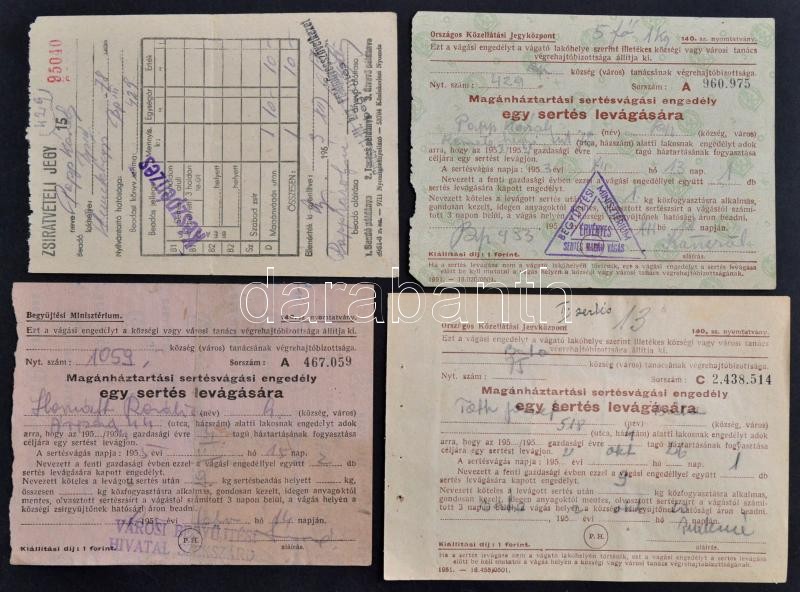 Leírás: 1952-55 3 db klf sertésvágási engedély + 1 zsírátvételi jegy 2x50f illetékbélyeggel