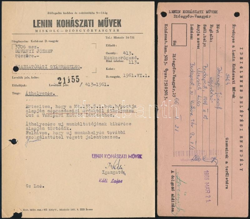 1961-1966 Lenin Kohászati Művek által kiállított 2 db okmány https://www.darabanth.com/hu/344-Gyorsarveres/344.0/Mutargy-papirregiseg-egyeb/Okmanyok~19/1961-1966-Lenin-Kohaszati-Muvek-altal-kiallitott-2-db-okmany~II1947102