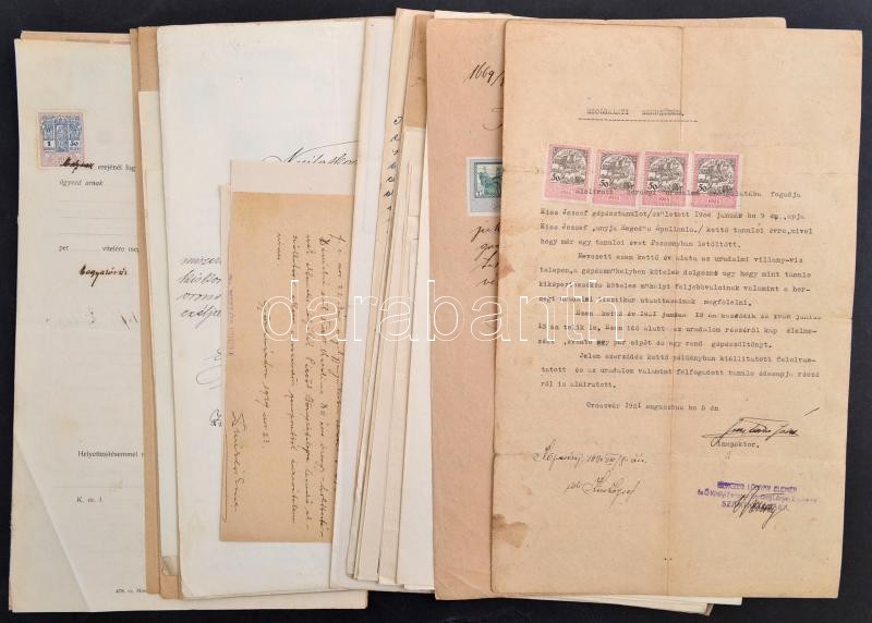 Leírás: Vegyes okmány tétel: 30 db különféle okmánybélyeges irat
