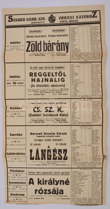 1931 Szeged szabad királyi városi színház előadásai, plakát, hajtott, ... https://www.darabanth.com/hu/344-Gyorsarveres/344.0/Mutargy-papirregiseg-egyeb/Plakat~7/1931-Szeged-szabad-kiralyi-varosi-szinhaz-eloadasai-plakat-hajtott-57C39729-cm~II1906439