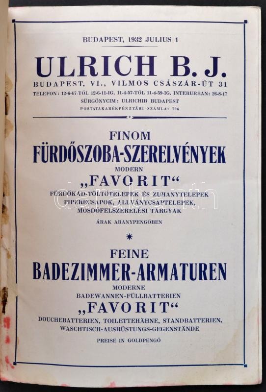 Leírás: 1932 Ulrich B. J. finom fürdőszoba-szerelvények árjegyzék, foltos papírkötésben