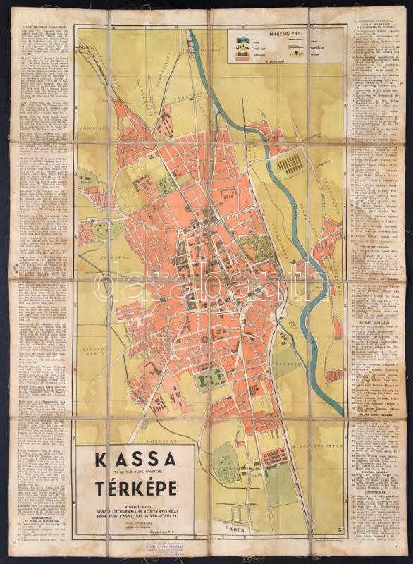 cca 1939-1940 Kassa tjh. sz. kir. város térképe, utcajegyzékkel, kiadja WIKO Litografiai és Könyvnyomdai Műintézet, 63x45 cm vászonra kasírozva, foltos.