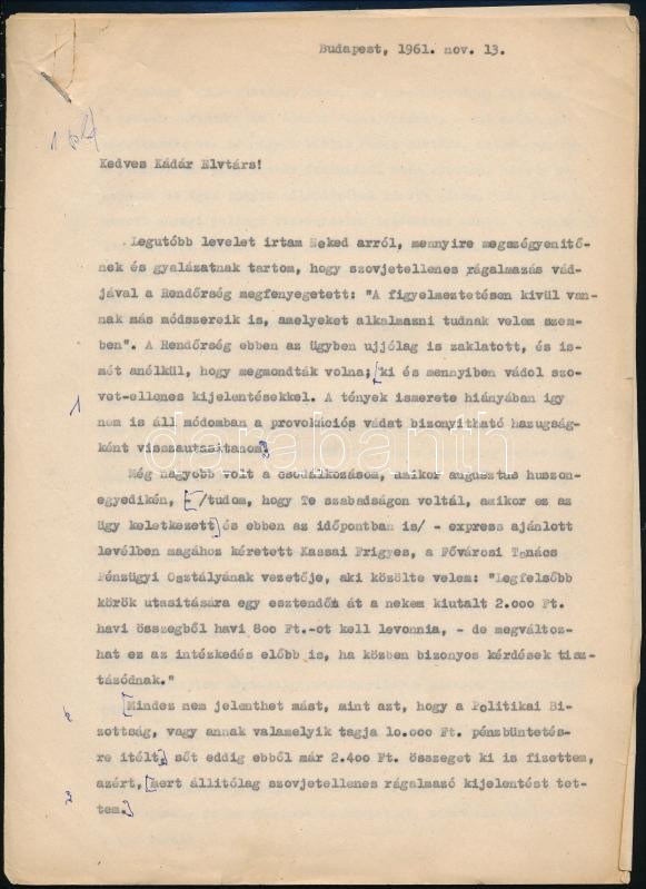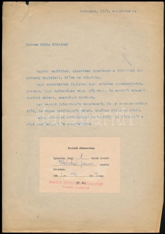 1961 Vas Zoltán (1903-1983) író, 56-os államminiszter két levele Kádár Jánosnak, az egyiken átvételi elismervénnyel. A levelekben annak kapcsán érdeklődik és magyarázkodik, hogy eljárás indult ellene a Szovjetunió rágalmazása miatt, illetve hitet tesz a párt politikája mellett, továbbá személyes találkozót javasol Kádárnak.