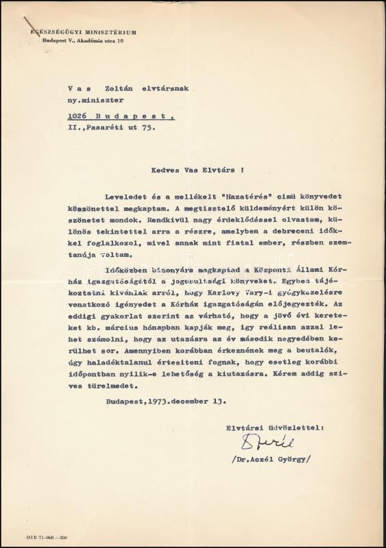 1973 Aczél György (1917-1991) saját kézzel aláírt levele Vas Zoltán (1903-1983) író, 56-os államminiszter részére, melyben megköszöni Hazatérés c. könyvének megküldését.