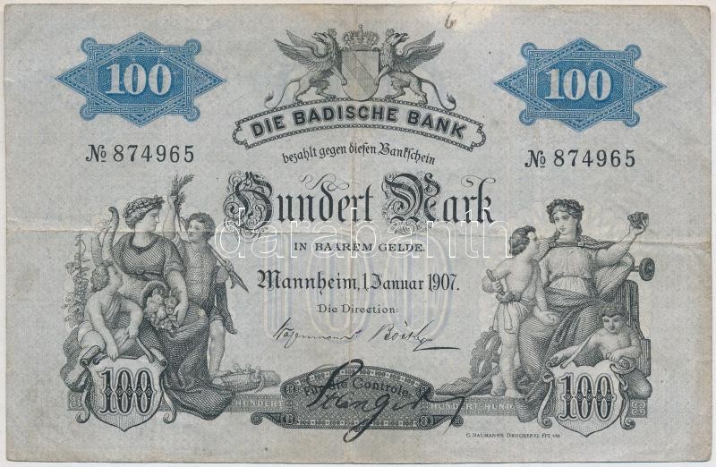 German States / Baden 1907. 10... https://www.darabanth.com/hu/344-Gyorsarveres/344.0/Numizmatika/Kulfoldi-bankjegyek~1000012/Nemet-Allamok-Baden-1907-100M-TIII-German-States-Baden-1907-100-Mark-CF~II1952705