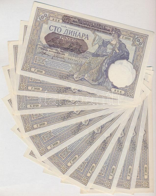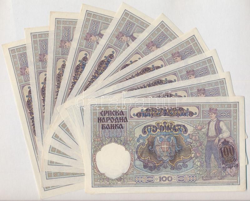 Serbia / German occupation 1941. 100 Dinara (10x) printed on Yugoslavian banknote, 5pcs of sequential serials and close serials C:UNC,AU