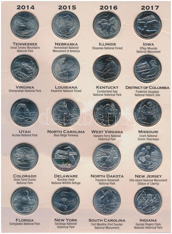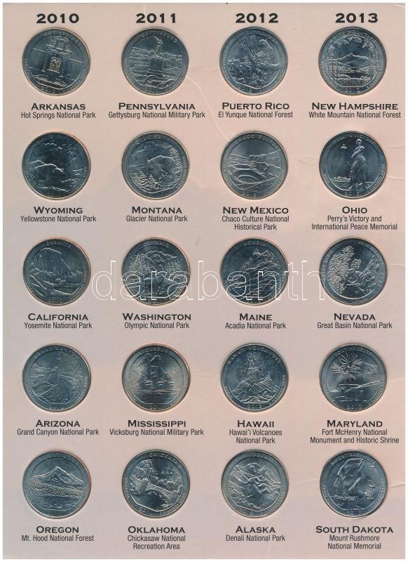 Amerikai Egyesült Államok 2010D-2017D 1/4$ Cu-Ni "Nemzeti Parkok" (40xklf) gyűjtői almbumban, 2017-ig teljes a szett, 2021-ig még üres helyek T:1,1-