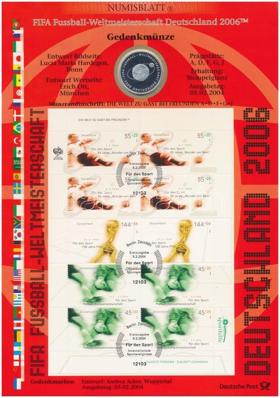 Németország 2004. 10E Ag "2006-os Labdarúgó Világbajnokság - Németország" német nyelvű információs lapon, "SPORTHILFE" bélyegsorral és FDC bélyegzéssel T:PP