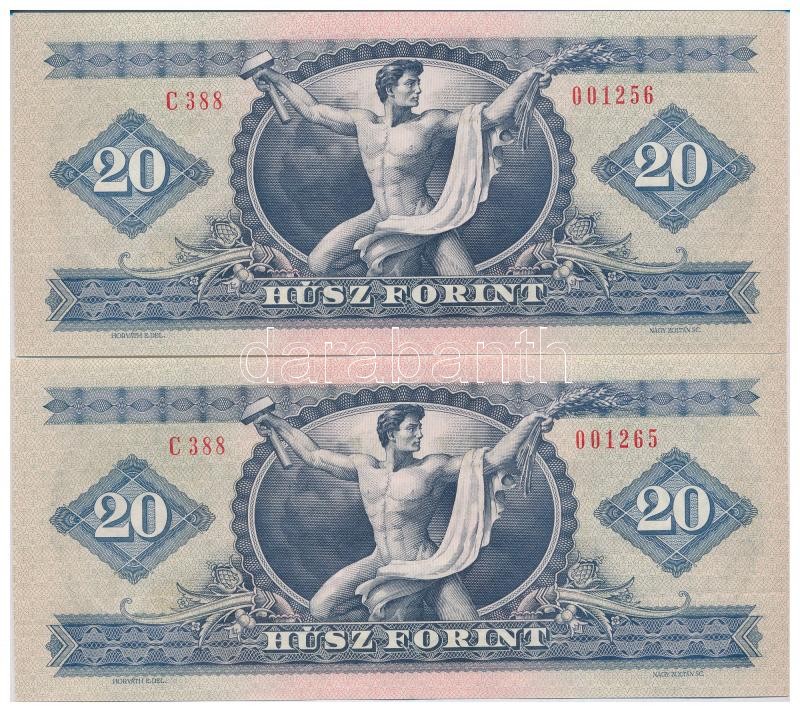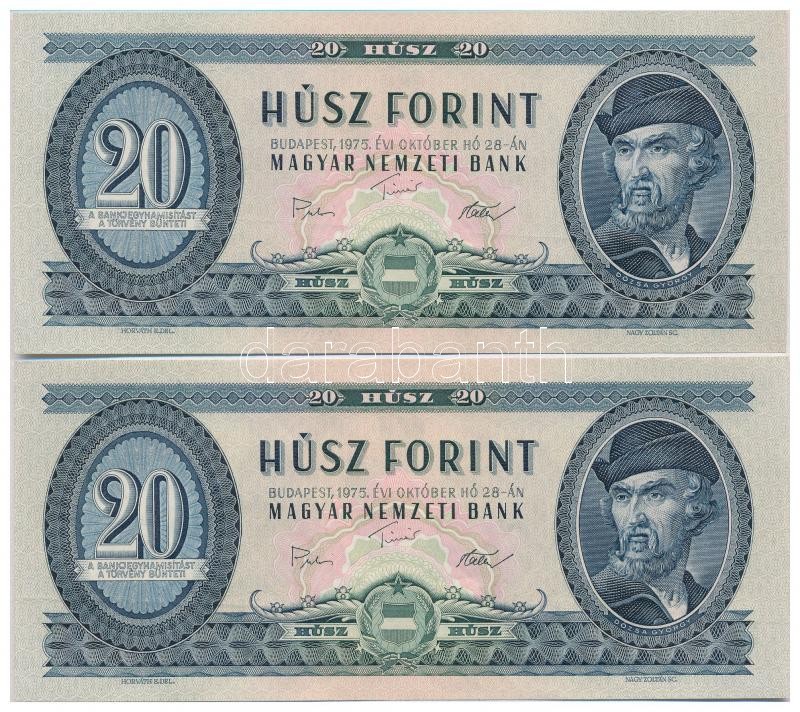 1975. 20Ft (2x) közeli sorszám T:I,II https://www.darabanth.com/hu/344-Gyorsarveres/344.0/Numizmatika/Magyar-bankjegyek~1000007/1975-20Ft-2x-kozeli-sorszam-TI-II~II1559482