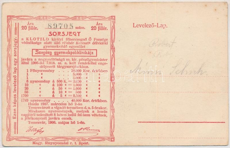 Budapest 1906. "Klotild királyi főherczegnő Ő Fensége védnöksége alatt álló 'Fehér Kereszt' délvidéki gyermekvédő egyesület" sorsjegye 20f értékben, levelezőlap hátoldalán, előlapon Királyi vár-részlet T:I-