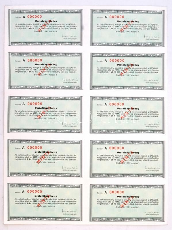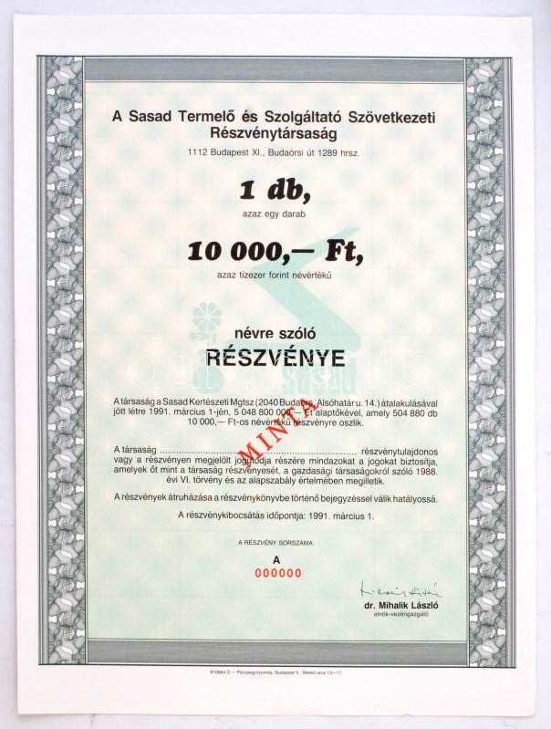 Budapest 1991. "Sasad Termelő és Szolgáltató Szövetkezeti Részvénytársaság" névre szóló részvénye 10.000Ft-ról, szelvényekkel és "MINTA" bélyegzéssel T:I,I-