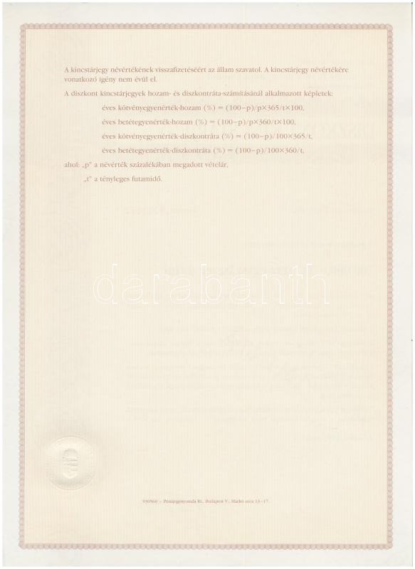 Leírás: Budapest 1993. "Diszkont Kincstárjegy" 100.000Ft-ról, szárazpecséttel, "MINTA" felülbélyegzéssel és "0000000"-ás sorszámmal T:I