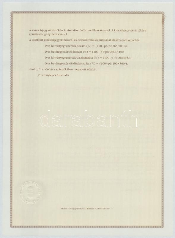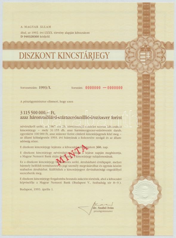 Budapest 1993. "Diszkont Kincstárjegy" harmincegyezer-százötven darab 100.000Ft névértékű kincstárjegy egyben, összesen 3.115.500.000Ft-ról, szárazpecséttel, "MINTA" felülbélyegzéssel és "0000000"-ás sorszámmal T:I