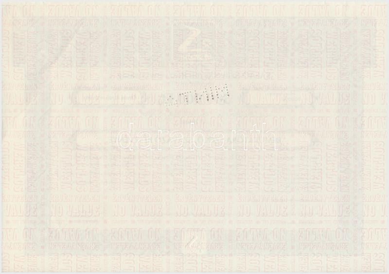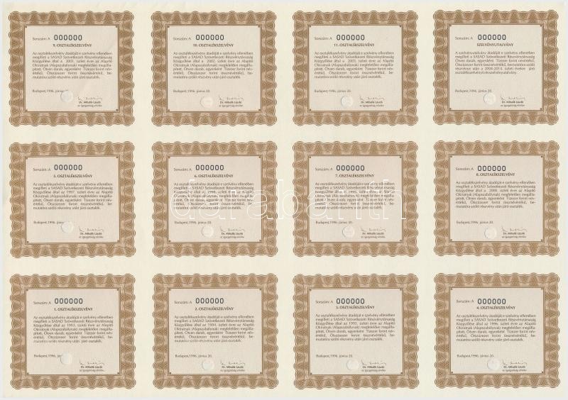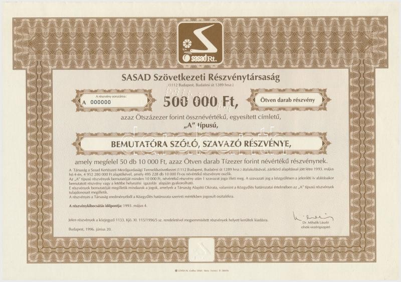 Budapest 1996. "SASAD Szövetkezeti Részvénytársaság" ötven darab bemutatóra szóló, szavazó részvénye összesen 500.000Ft-ról, "A" típus, szárazpecséttel és szelvényekkel, "MINTA" perforáció T:I,I-