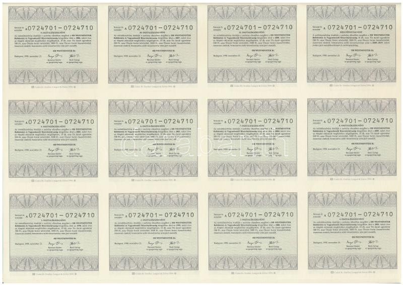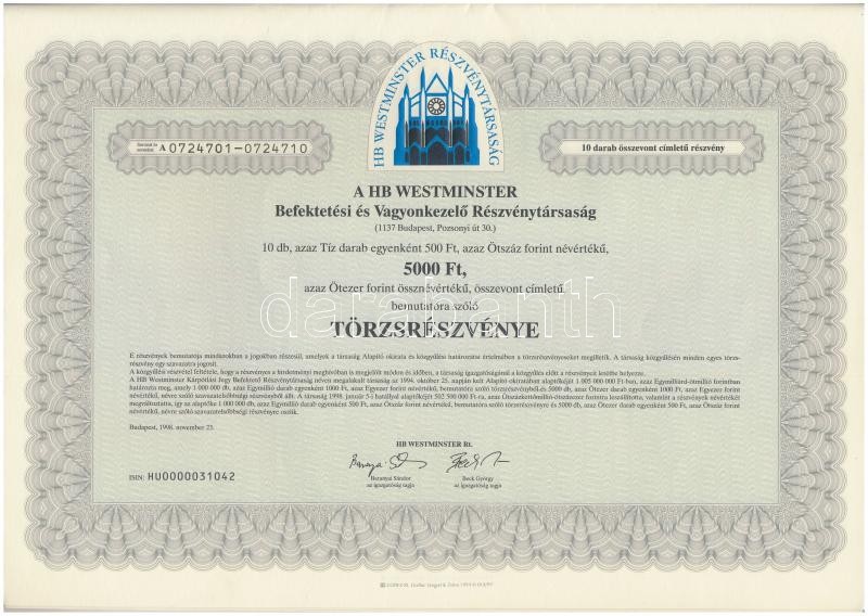 Budapest 1998. "A HB Westminster Befektetési és Vagyonkezelő Részvénytársaság" 5000Ft értékű bemutatóra szóló törzsrészvénye, szelvényekkel (5x) sorszámkövetők T:I