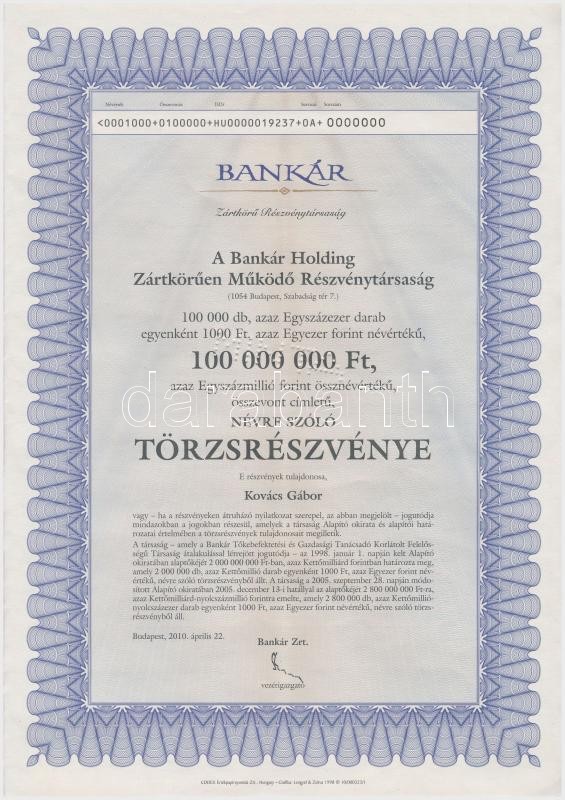 Budapest 2010. "Bankár Holding Zártkörűen Működő Részvénytársaság" százezer darab névre szóló törzsrészvénye egyenként 1000Ft-ról, szelvényekkel, "MINTA" bélyegzéssel T:II