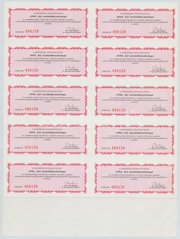 Leírás: Pécs 1989. "Pannónia Innováció Részvénytársaság" bemutatóra szóló részvénye 10.000Ft-ról, szelvényekkel T:I,I-