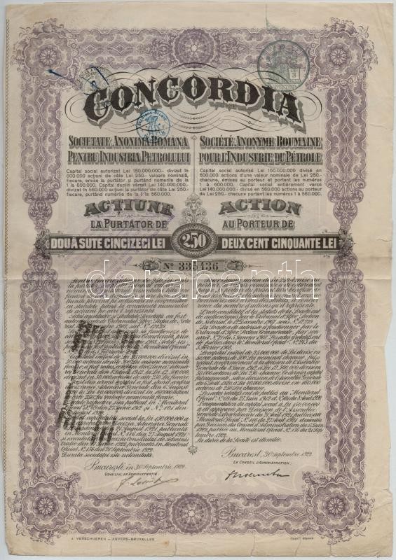 Románia 1922. "Concordia" részvény 250L-ről bélyegzéssel és szelvényekkel + 1941. Kötvény 1000L-ről bélyegzéssel T:III,III-