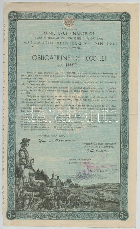 Romania 1922. "Concordia" share about 250 Lei with overprint and coupons + 1941. Bond about 1000 Lei with overprint C:F,VG