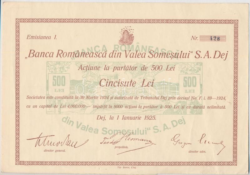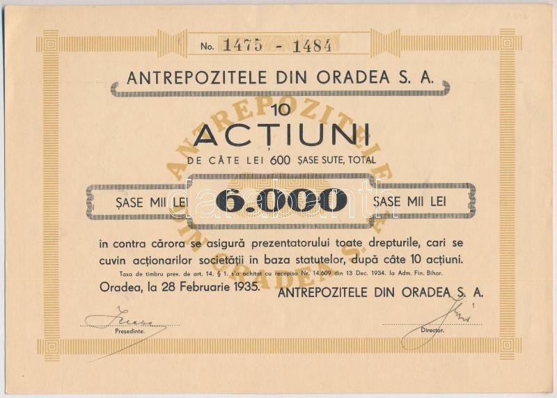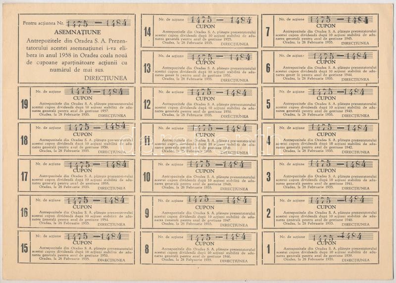 Románia 1925. "Banca Romaneasca a Szamos-völgyében" részvény 500L-ről, szelvényekkel + 1935. "Nagyváradi Raktárak" részvény 6000L-ről szelvényekkel T:I-